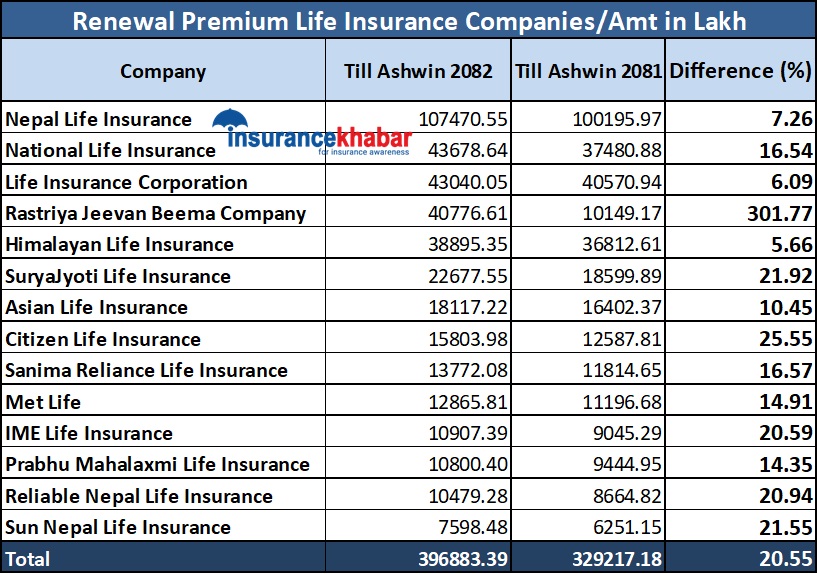 Nepal Life Insurance has collected Rs 2.1 billion in renewal premiums, followed by Surya Jyoti Life Insurance Rs 2.4 billion, Asian Life Insurance Rs 1.81 billion, Citizen Life Insurance Rs 1.58 billion and Reliance Life Insurance Rs 1.87 billion. Likewise, Himalayan Life Insurance has increased by 5.66 percent, Surya Jyoti Life Insurance by 21.92 percent, Asian Life Insurance by 10.45 percent, Citizen Life Insurance by 25.55 percent and Sanima Life Insurance by 17.57 percent.