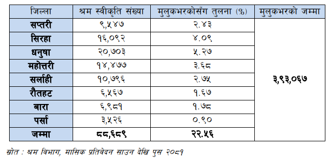 A total of 20,703 people from Dhanusha have obtained labour permits as the district with the highest number of labour exporters for foreign employment in the country. This is 5.27 per cent of the total labour permits.