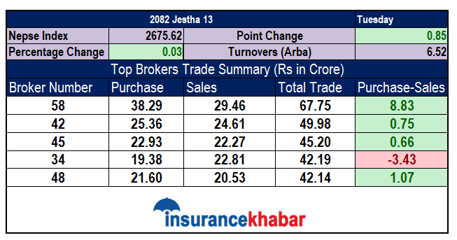 Broker number 58 has made a transaction of Rs 677.5 million, out of which Rs 382.9 million has been purchased and Rs 294.6 million has been sold. Similarly, broker number 42 has purchased Rs 253.6 million and sold rs 246.1 million.