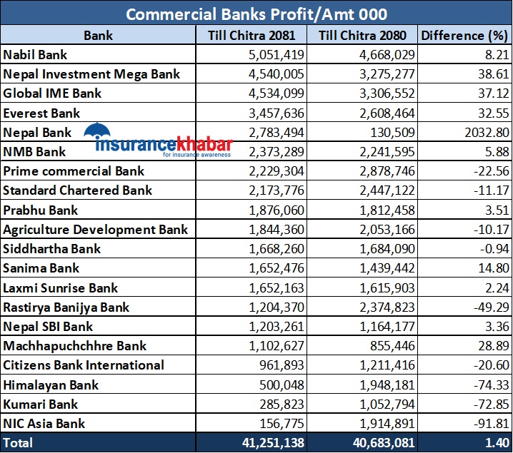 According to the data released by the Nepal Rastra Bank (NRB) for the nine months of the current fiscal year, 20 commercial banks have earned a profit of Rs 41.25 billion. In the same period last year, commercial banks had earned a profit of Rs 40.68 billion. The bank’s profit increased by 1.40 percent in the review period compared to the previous year.