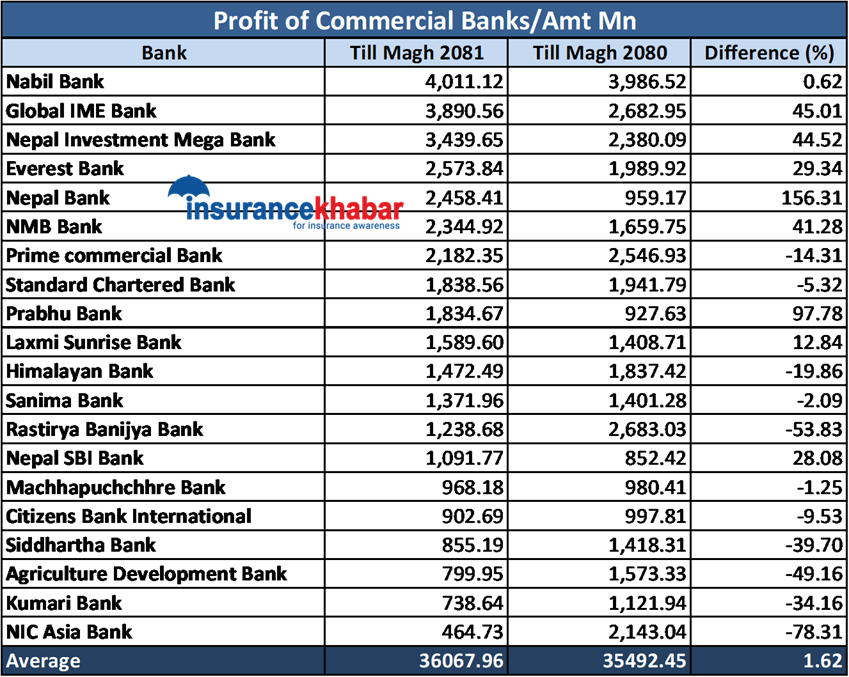 As of Magh of the current fiscal year, Standard Chartered Bank has earned a profit of Rs 1.8385 billion, Prabhu Bank has earned a profit of Rs 1.8386 billion, Lakshmi Sunrise Bank has earned a profit of Rs 1.5896 billion, Himalayan Bank has earned a profit of Rs 1.4724 billion, and Sanima Bank has earned a profit of Rs 1.3719 billion. Compared to the previous year, Prabhu Bank increased by 97.78 percent, Laxmi Sunrise Bank by 12.85 percent, while Standard Chartered, Himalayan and Sanima Banks decreased.