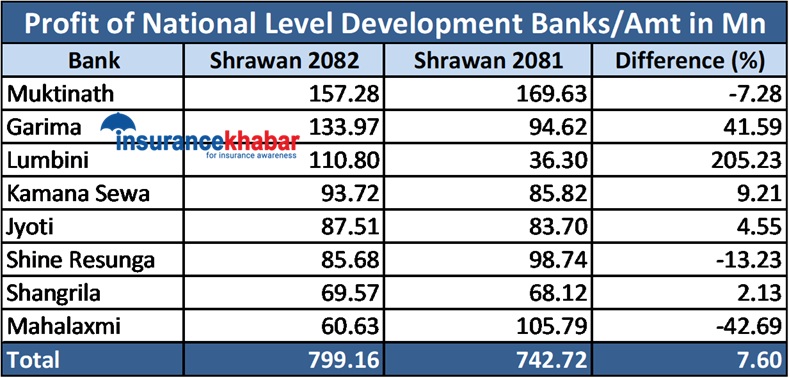 According to the data released by Nepal Rastra Bank, eight development banks have earned a net profit of Rs 79.91 crore in the current fiscal year. Last year, 2081. These banks had earned a profit of Rs 74.27 crore in July 2018. The profit of these banks increased by 7.60 percent in the review period compared to the previous year.