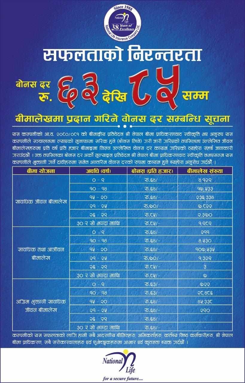 Kathmandu. National Life Insurance Company fiscal year 2080. The bonus rate has been announced for 81.