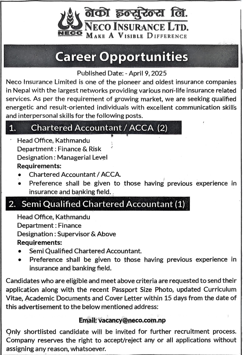 Kathmandu. Neco Insurance has requested employees for its central office. The company has requested 2 Chartered Accountants and 1 Semi-Qualified Chartered Accountant.