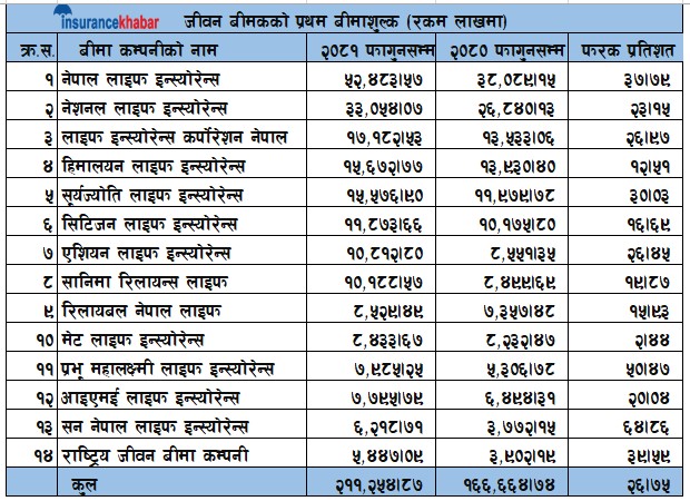 Up to Falgun in the current fiscal year, Nepal Life has collected the highest first insurance premiums. The company has collected first insurance premiums of 5.24 billion rupees. Which is a new business increase of 37.79 percent compared to the previous year. National Life is in second place. The company has collected first insurance premiums of 3.30 billion rupees during this period. Which is a new business increase of 23 percent compared to the previous year. LIC Nepal is in third place. The company has collected Rs 1.71 billion in first premiums during this period. This is a new business increase of 26.92 percent compared to the previous year.