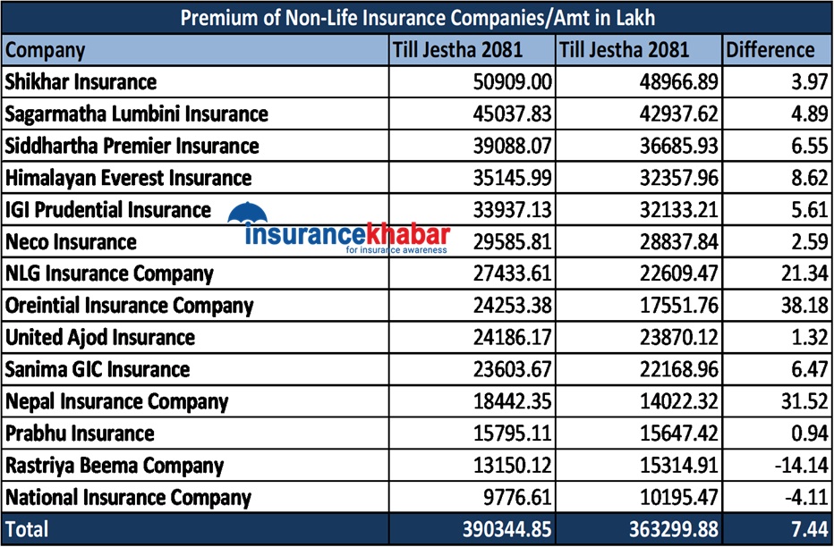 According to the data released by the Nepal Insurance Authority (NEA) till May 2018, 14 non-life insurers have issued 2,587,315 insurance policies and earned a total insurance premium of Rs 39.03 billion. In the same period last year, the companies had issued 2,608,792 policies and earned a total insurance premium of Rs 36.32 billion. Compared to the previous year, the business of companies increased by 7.44 percent in the review period.