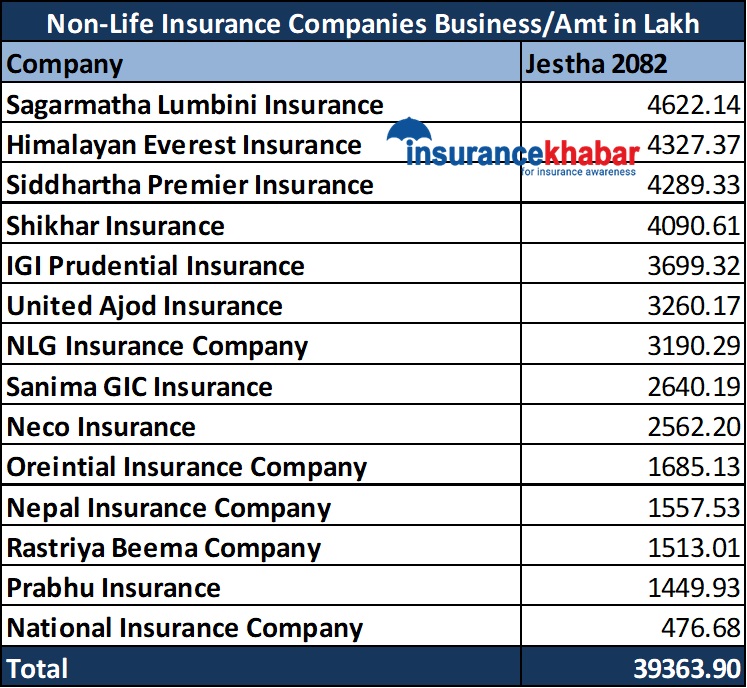 According to the data released by the Nepal Insurance Authority(NEA), 14 non-life insurers sold a total of 228,804 insurance policies in May alone and collected a total of Rs 3.93 billion in insurance premiums. Sagarmatha Lumbini Insurance is the largest importer of business in May. The company has earned a total insurance premium of Rs 462.2 million in a month.