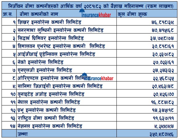 Neco Insurance has collected a total insurance premium of Rs 2.70 billion. NLG Insurance Company has collected a total insurance premium of Rs 2.42 billion. Oriental Insurance has collected a total insurance premium of Rs 2.25 billion.