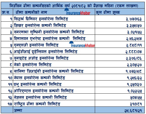 Kathmandu. Non-life insurance companies have collected a total insurance premium of more than Rs 3 billion in the month of Baishakh of the fiscal year 2081/82 BS alone. These companies sold 223,278 insurance policies in the month of Baishakh alone and collected a total of Rs 2.96 billion in insurance premiums.