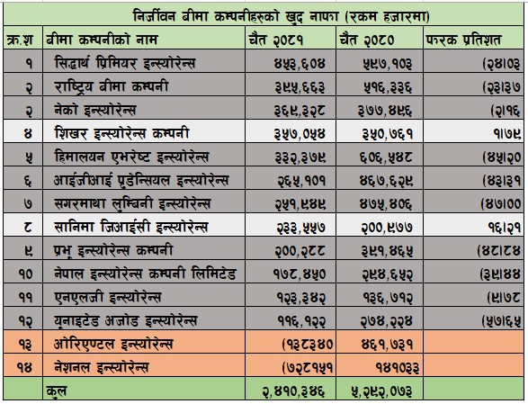 Kathmandu. Non-life insurance companies have published financial statements for the third quarter of the fiscal year 2081/82 BS. According to the financial statements published by the companies, two companies Oriental Insurance and National Insurance Company are in losses. Compared to the same period last year, the profit of 10 companies has decreased.