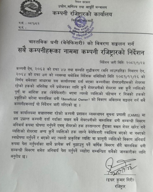 Kathmandu. The Office of the Registrar of Companies has now issued instructions to declare the details of all genuine shareholders at the time of registration of the company.