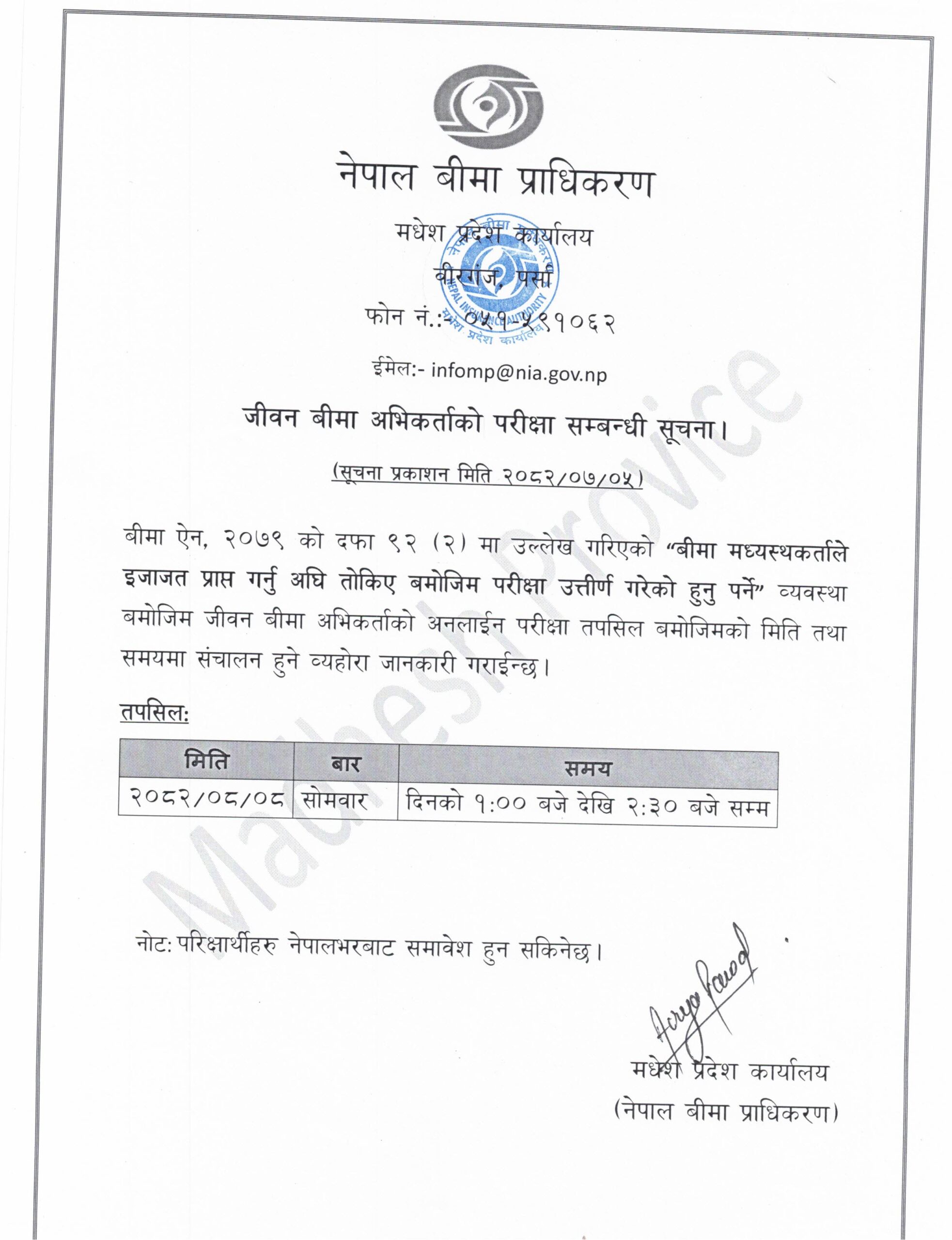 Kathmandu. Nepal Insurance Authority’s Madhesh Province Office is going to conduct agent examination. The provincial office of the Authority has stated that it is going to conduct the online examination of the agents on November 22. The exam will run from 1:00 pm to 2:30 pm.