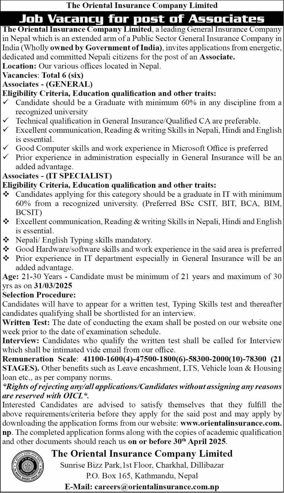 Kathmandu. There are five days left to apply for the employees of various posts demanded by Oriental Insurance Company. The company has asked for six employees for associate (general) and IT specialist. The company has sought employees for its various branch offices across Nepal. Interested and eligible candidates will have to apply by April 30.