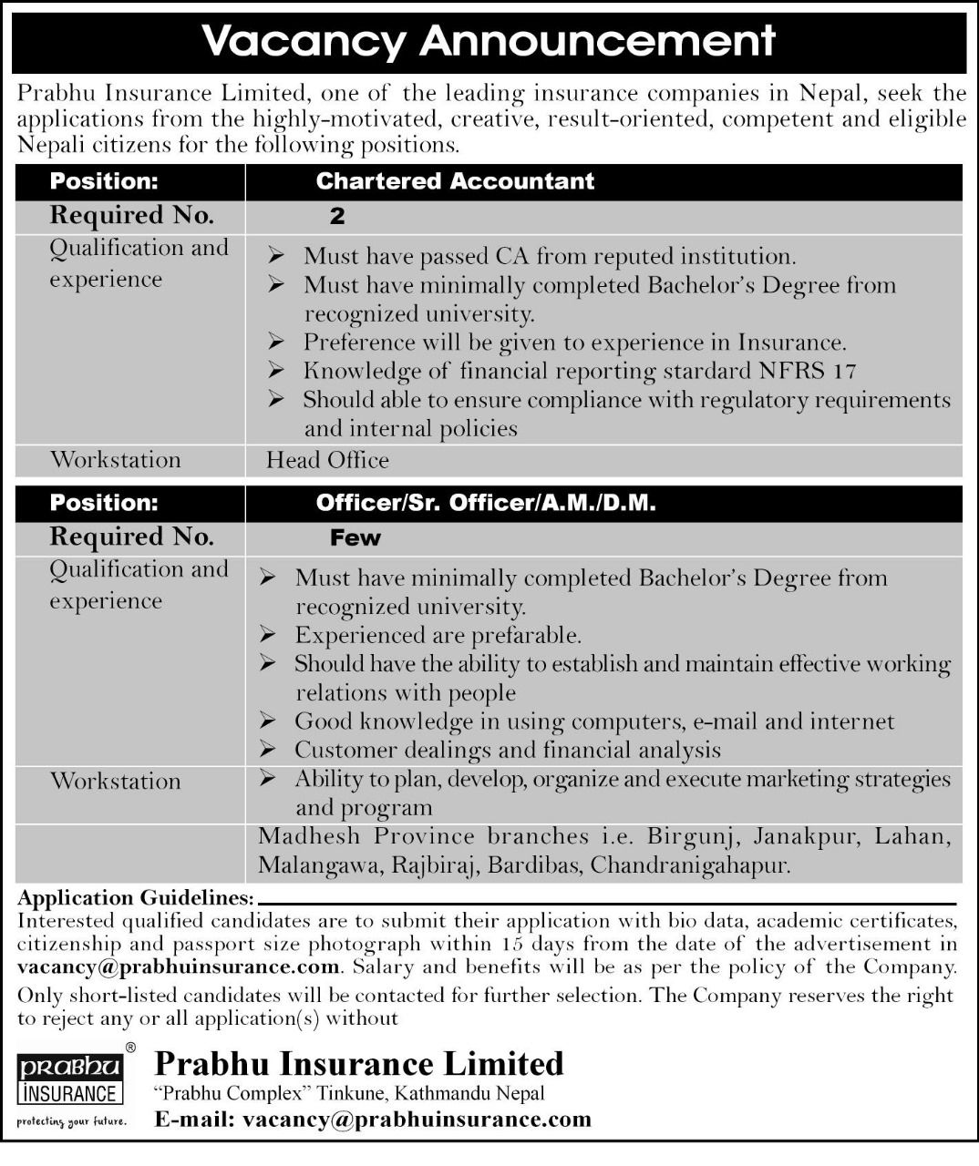 Kathmandu. Prabhu Insurance Limited has invited applications for various posts. The company has asked for two employees for chartered accountant and officer senior officer AM DM.