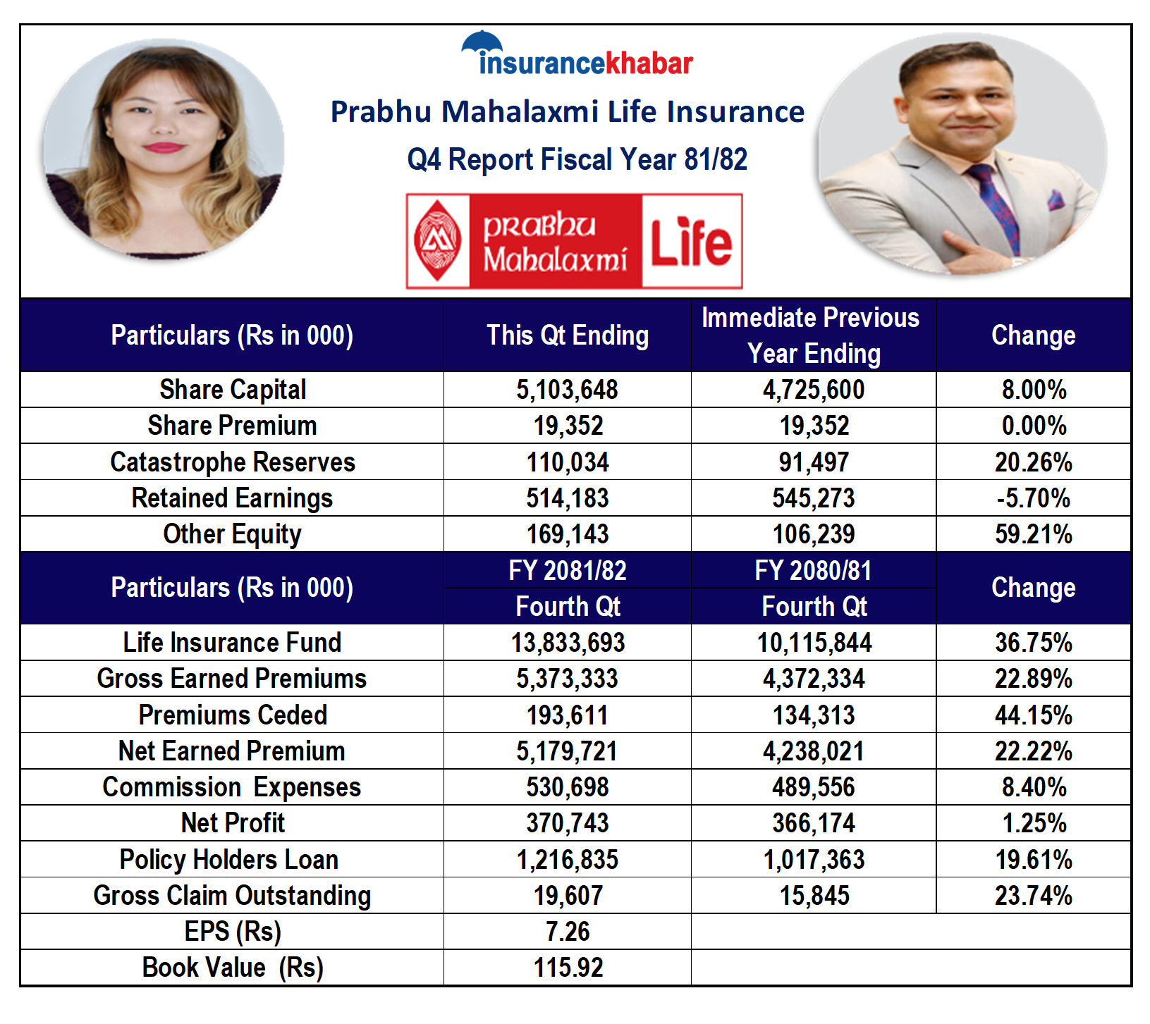 Kathmandu. Prabhu Mahalakshmi Life Insurance has published the financial statements for the fourth quarter of the fiscal year 2081/82 BS. The company with a share capital of Rs 5.10 billion has earned a profit of Rs 370 million in the fourth quarter of the last fiscal year. In the same period of the previous fiscal year, the company had posted a profit of Rs 366.1 million. The company’s profit has increased by 1.25 percent compared to the same period of the previous fiscal year.