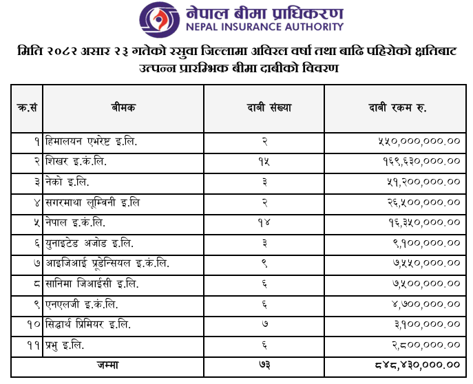 Kathmandu. Rasuwa: The Nepal Insurance Authority (INSURANCE) has made public the updated details of the insurance claims for the damage caused by the massive floods and landslides in Rasuwa on July 15.