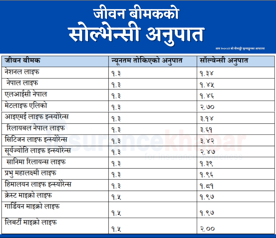 Kathmandu. The Nepal Insurance Authority (INSURANCEA) has released the schedule of solvency ratio determined on the basis of the actuarial assessment of 14 of the life insurers for the last fiscal year. NeA has made public the solvency ratio of life insurers through a monthly special issue called ‘Bima Pratibimb’.