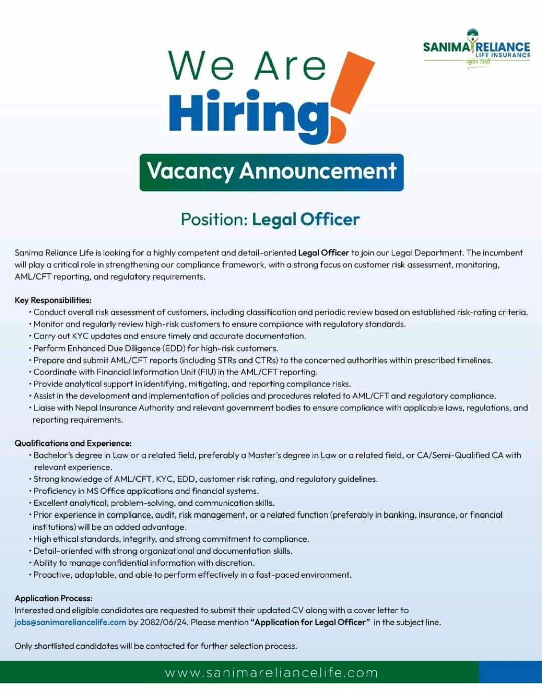 Kathmandu. Sanima has four days left to apply for the Kaharmachari application sought by Reliance Life. The company has asked for employees for legal officers. Candidates should have a bachelor’s degree in law. Those interested in applying for the post can apply for the post by October 24.