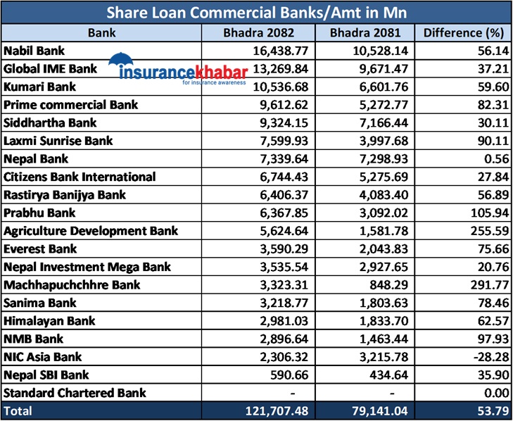 As of the review period, Nabil Bank is the largest lender in terms of share loan, while Machhapuchchhre is ahead in terms of growth rate. Share loans from 18 banks increased in the review period compared to the previous year. NIC Asia has reduced its share loan while Standard Chartered Bank has not issued loans under this head.