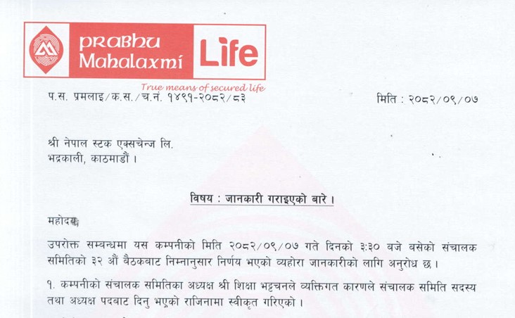 Kathmandu. Chairperson of Prabhu Mahalaxmi Life Insurance, Shiksha Bhattachan, has resigned from her post on Tuesday. She has resigned from the post citing her personal reasons. A meeting of the Board of Directors of the company held on December 20 approved his resignation.