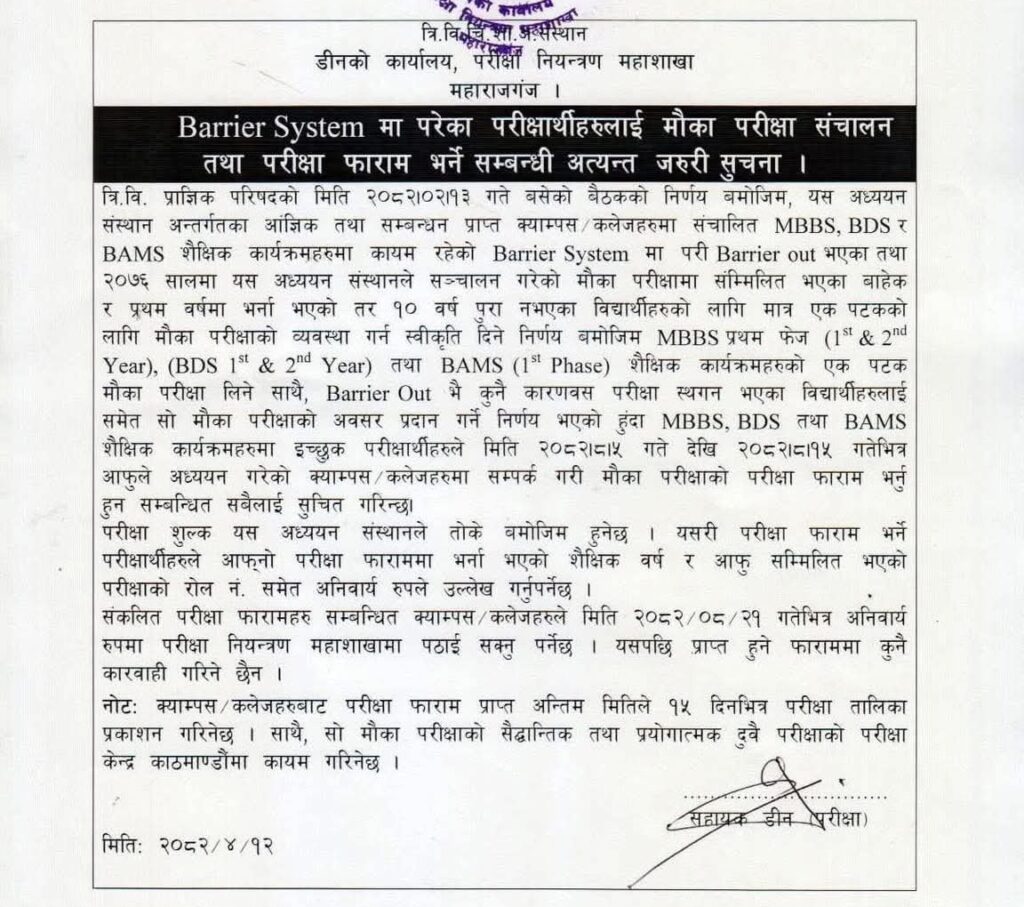 Kathmandu. Tribhuvan University Institute of Medical Studies (TUTH) has decided to take part in the secondary examinations for students who failed to continue their studies after repeatedly failing in the undergraduate level examinations.