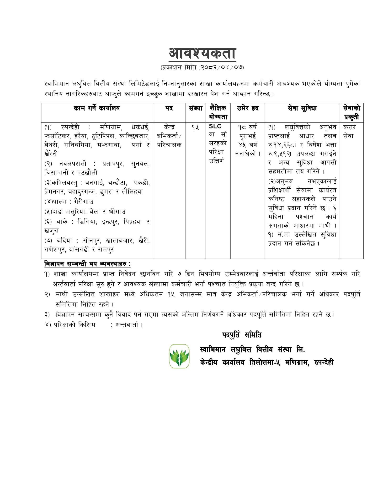 Kathmandu. Swabhimaan Laghubitta Financial Institution has demanded a center agent operator. The organization has asked for 15 employees for the post. The organization has demanded employees for 43 branch offices. Interested and qualified candidates should apply within 7 days from the date of publication of the notice.