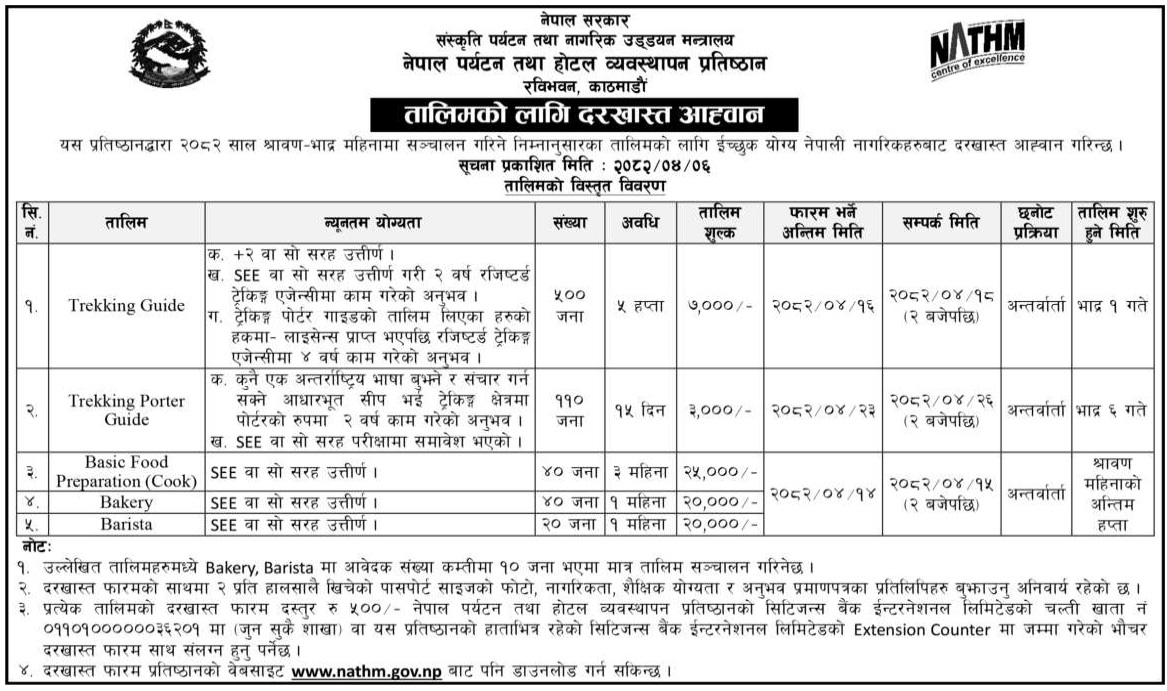 Nepal Tourism and Hotel Management Foundation (NATHM) under the Ministry of Culture, Tourism and Civil Aviation is going to conduct skill-based training. NATHM will conduct training for trekking guides, trekking porter guides, basic food preparations(cooks), bakeries and baristas. A total of 710 people will benefit from these trainings.