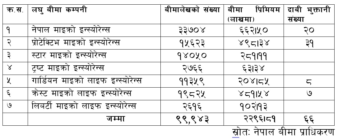 Keeping this in mind, after joining health insurance through micro insurance, it should be ensured that ‘it is my responsibility not to let the disease occur, and if the disease occurs, it is the company’s responsibility to provide financial facilitation for health treatment up to the specified limit’ through insurance policies under micro insurance. This helps the insured to focus on improving their health by relieving them of the stress of expenses during times of risk. Which is real risk management for the target group. The regulatory body targeting low-income people; Nepal Insurance Authority has been regulating all life and non-life insurance companies by making provisions for issuing micro insurance policies, but based on the data that has not achieved the expected results, 7 micro insurance companies have been granted permission since last year to only do micro insurance. There are 4 micro non-life insurance companies, namely Trust Micro Insurance, Nepal Micro Insurance, Star Micro Insurance and Protective Micro Insurance, and 3 micro life insurance companies, namely Guardian Micro Life, Crest Micro Life and Liberty Micro Life. In addition, these companies have been divided into 7 provinces and have been granted operating permits with their head offices in separate provinces. Accordingly, all 7 micro insurance companies have started their operations. According to the data published by the Nepal Insurance Authority, the progress achieved by these companies till mid-Chait 2080 is as follows: