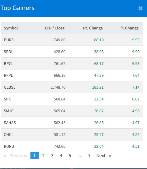 Today, the investors of Butwal Power Company, Pure Energy and Synergy Power Company have earned the most. Today, the investors of these three companies have earned 9.99 percent. Investors of River Falls Power earned 7.94 percent.