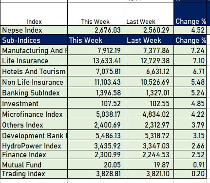 Kathmandu. During the week, the NEPSE index increased by 4.52 percent. The market closed at 2,676.03 points after closing at 2560.29 points last week. The market has gained 115.74 points this week.