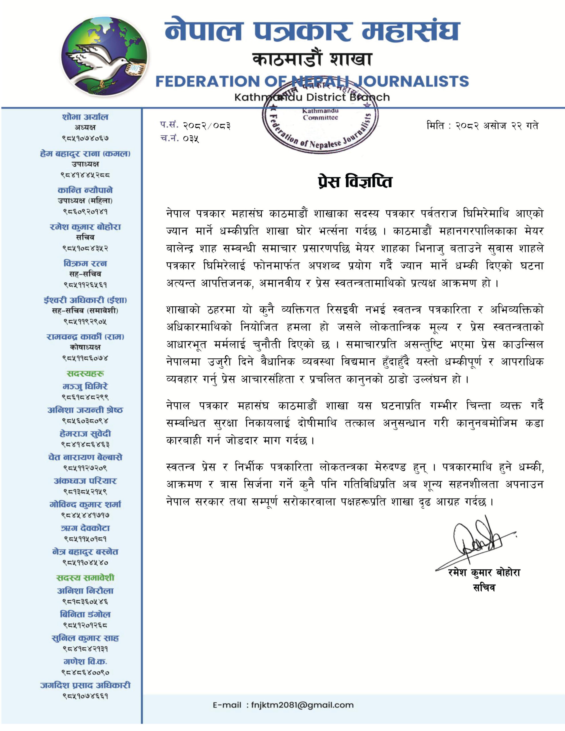 शाखाका सचिव रमेश कुमार बोहोराले थप भने “स्वतन्त्र प्रेस र निर्भीक पत्रकारिता लोकतन्त्रका मेरुदण्ड हुन् । पत्रकारको सुरक्षा सुनिश्चित गर्नु राज्यको प्राथमिक दायित्व हो ।”