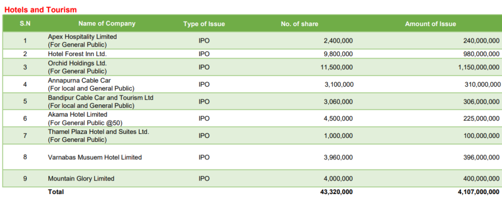 सेबोनले प्रकाशन गरेको तथ्यांक अनुसार, एपेक्स हस्पिटालिटी, होटल फरेष्ट इन, अर्किड होल्डिङ्गस, अकामा होटल लिमिटेड, ठमेल प्लाजा होटल एण्ड सुइट्स लिमिटेड, वर्णवास म्युजियम होटल लिमिटेड र माउण्टेन ग्लोरी लिमिटेडको आइपिओ पाइपलाइनमा रहेको छ।