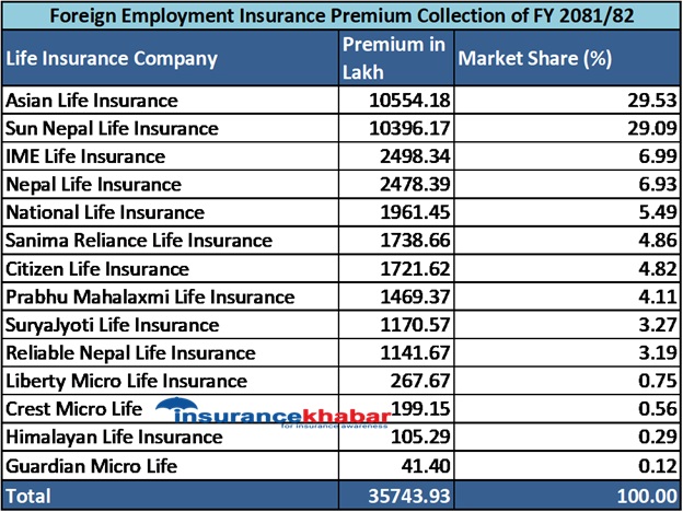 कुल वैदेशिक रोजगार बीमा व्यवसायमा एसियन लाइफ र सन नेपाल लाइफको हिस्सा लगभग समान २९ प्रतिशतभन्दा बढी देखिएको छ। वैदेशिक रोजगार बीमालेख जारी गरेर एसियन लाइफले १ अर्ब ५ करोड ५४ लाख रुपैयाँ र सन नेपाल लाइफले १ अर्ब ३ करोड ९६ लाख रुपैयाँ बीमाशुल्क आर्जन गरेका छन्। यी दुवै कम्पनीको बजार हिस्सा क्रमशः २९.५३ प्रतिशत र २९.०९ प्रतिशत रहेको छ।
