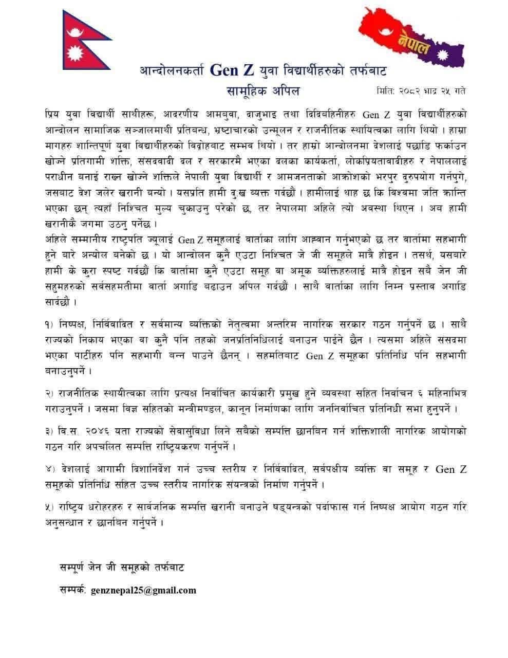 जेनजी युवा विद्यार्थीका तर्फबाट आज जारी सामूहिक अपिलमार्फत यस्तो धारणा सार्वजनिक गरेका हुन्। जेनजी युवा विद्यार्थीले वार्ताका लागि ५ बुँदे प्रस्ताव पनि अघि सारेका छन्।