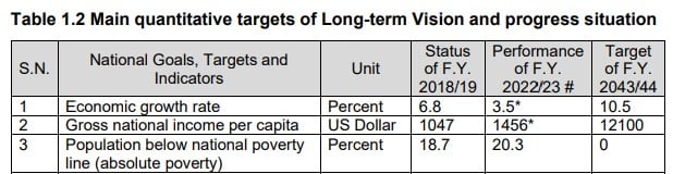 राष्ट्रिय योजना आयोगको प्रतिवेदनमा नेपालको आर्थिक वृद्धिदर अबको २० वर्ष अर्थात सन् २०४३।४४ मा १०.५ प्रतिशत पुग्ने प्रक्षेपण गरिएको छ। जब कि २०२२।२३ मा नेपाल आर्थिक वृद्धिदर ३.५ प्रतिशतमात्रै रहेको थियो।