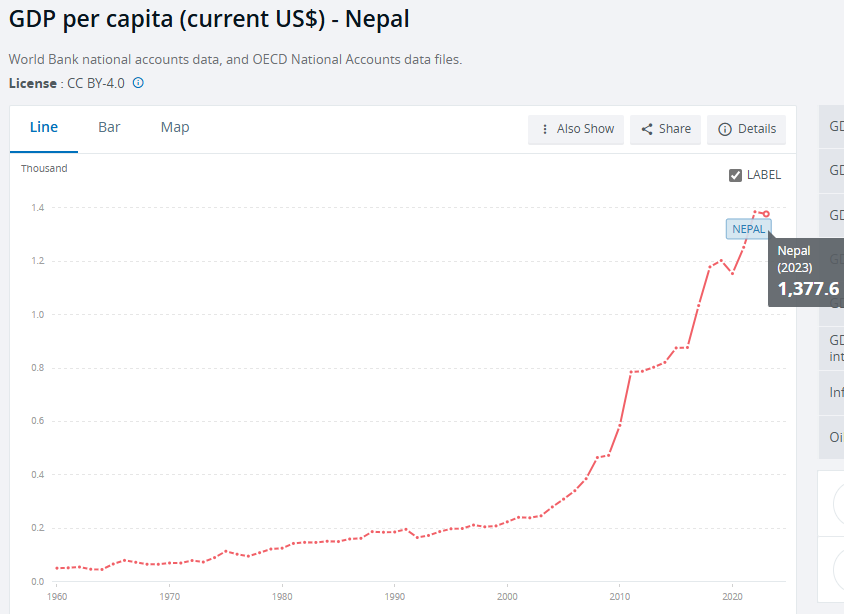 पछिल्लो समय देखिएको आर्थिक सुस्तताका कारण विश्व बैंकले सन् २०२३ मा नेपालमा प्रतिव्यक्ति आय घटाएको छ। अघिल्लो वर्ष सन् २०२२ मा विश्व बैंकले नेपालमा प्रतिव्यक्ति आय १ हजार ३८५.९ डलर (करिब १ लाख ८९ हजार रुपैयाँ) कायम गरेको थियो।
