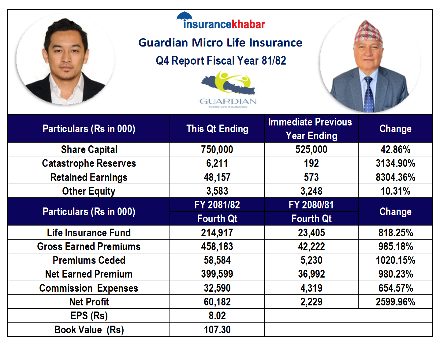 काठमाडौं । गार्डियन माइक्रो लाइफ इन्स्योरेन्सले गत आर्थिक वर्ष २०८१ /८२ को चौथो त्रैमासको अपरिष्कृत वित्तीय विवरण प्रकाशन गरेको छ । कम्पनीले प्रकाशन गरेको वित्तीय विवरण अनुसार कम्पनीको अधिकांश सूचक बढेको छ ।