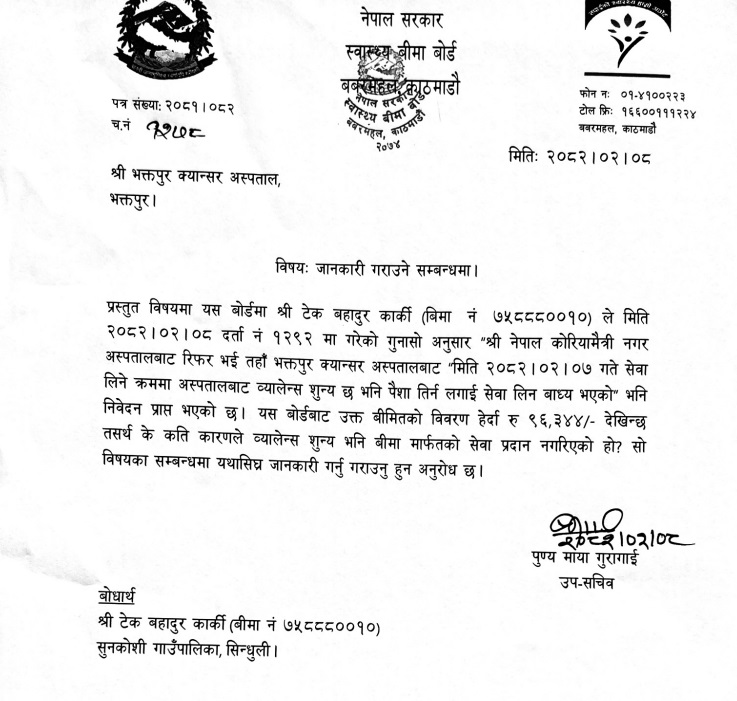 सोही उजुरीका आधारमा स्वास्थ्य बीमा बोर्डले भोलिपल्ट नै भक्तपुर क्यान्सर अस्पतालका नाममा पत्र काट्दै पैसा हुँदाहुँदै किन ब्यालेन्स शून्य भनी बीमामार्फत स्वास्थ्य सेवा प्रदान गरिएको हो भन्दै स्पष्टीकरण सोधेको छ। यस विषयमा यथाशीघ्र जानकारी गराए पनि भक्तपुर क्यान्सर अस्पताललाई बोर्डले निर्देशन दिएको छ।