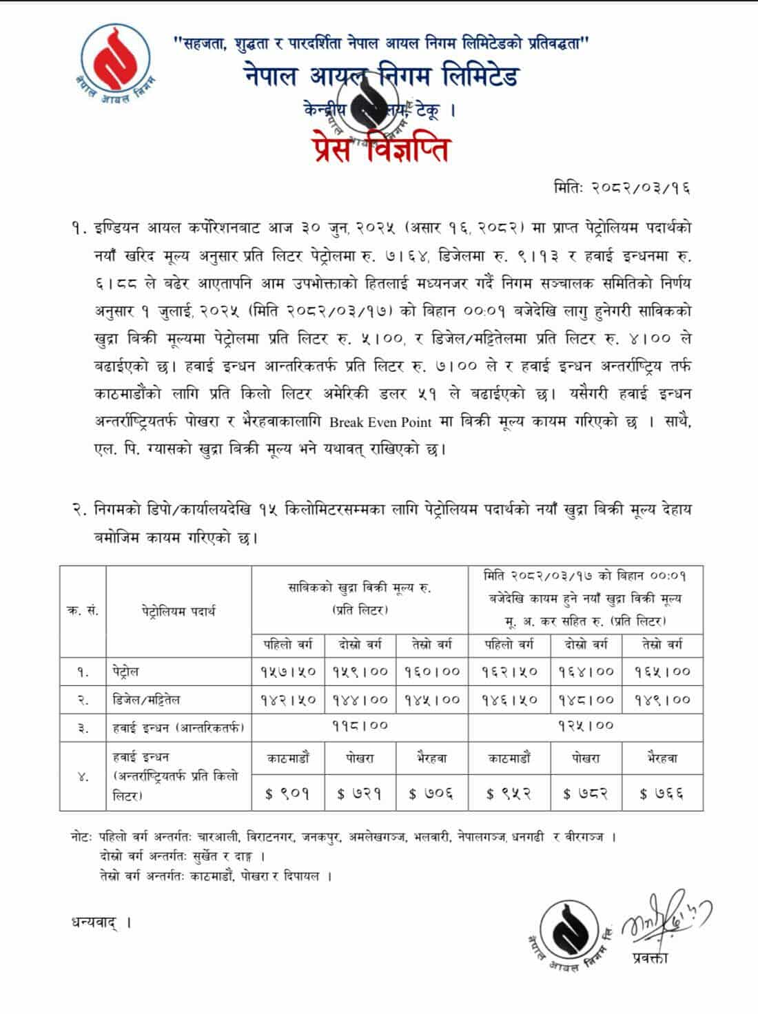 नेपाल आयल निगमले असार १७ गते बिहान ००ः०१ बजेबाट लागू हुने गरी पेट्रोलियम पदार्थको मूल्य बढाएको हो। इन्डियल आयल कर्पोरेसन (आईओसी)ले मूल्य समायोजन गरेर पठाएसँगै निगमले पेट्रोलियम पदार्थको मूल्य बढाएको हो।