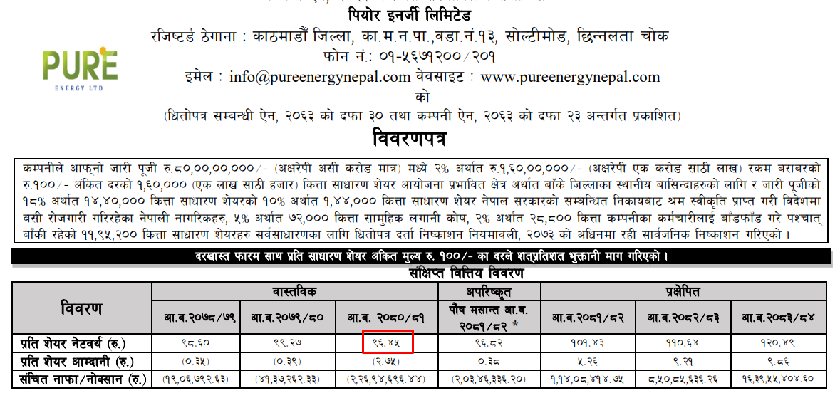 पहिलो शेयर कारोबारका लागि नेप्सेले कम्पनीको वास्तविक प्रतिशेयर नेटवर्थदेखि त्यसको तीनगुणासम्म मूल्य रेन्ज तोक्ने गर्दछ। कम्पनीको पछिल्लो वास्तविक प्रतिशेयर नेटवर्थ ९६.४५ रुपैयाँ रहेको छ।