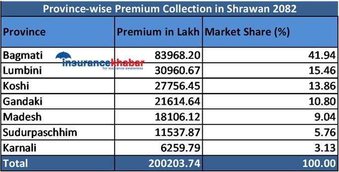 नेपाल बीमा प्राधिकरणले सार्वजनिक गरेको तथ्यांकअनुसार १४ वटा जीवन बीमा कम्पनी र ३ वटा लघु जीवन बीमा कम्पनीले चालु आर्थिक वर्ष २०८२।८३ को पहिलो महिना साउनमा २० अर्ब २ करोड ३ लाख रुपैयाँ कुल बीमाशुल्क आर्जन गरेका छन्। बीमकहरुले बागमती प्रदेशबाट मात्रै ८ अर्ब ३९ करोड ६८ लाख रुपैयाँ बीमाशुल्क संकलन गरेका छन्। यो कुल व्यवसायको ४१.९४ प्रतिशत हिस्सा हो।