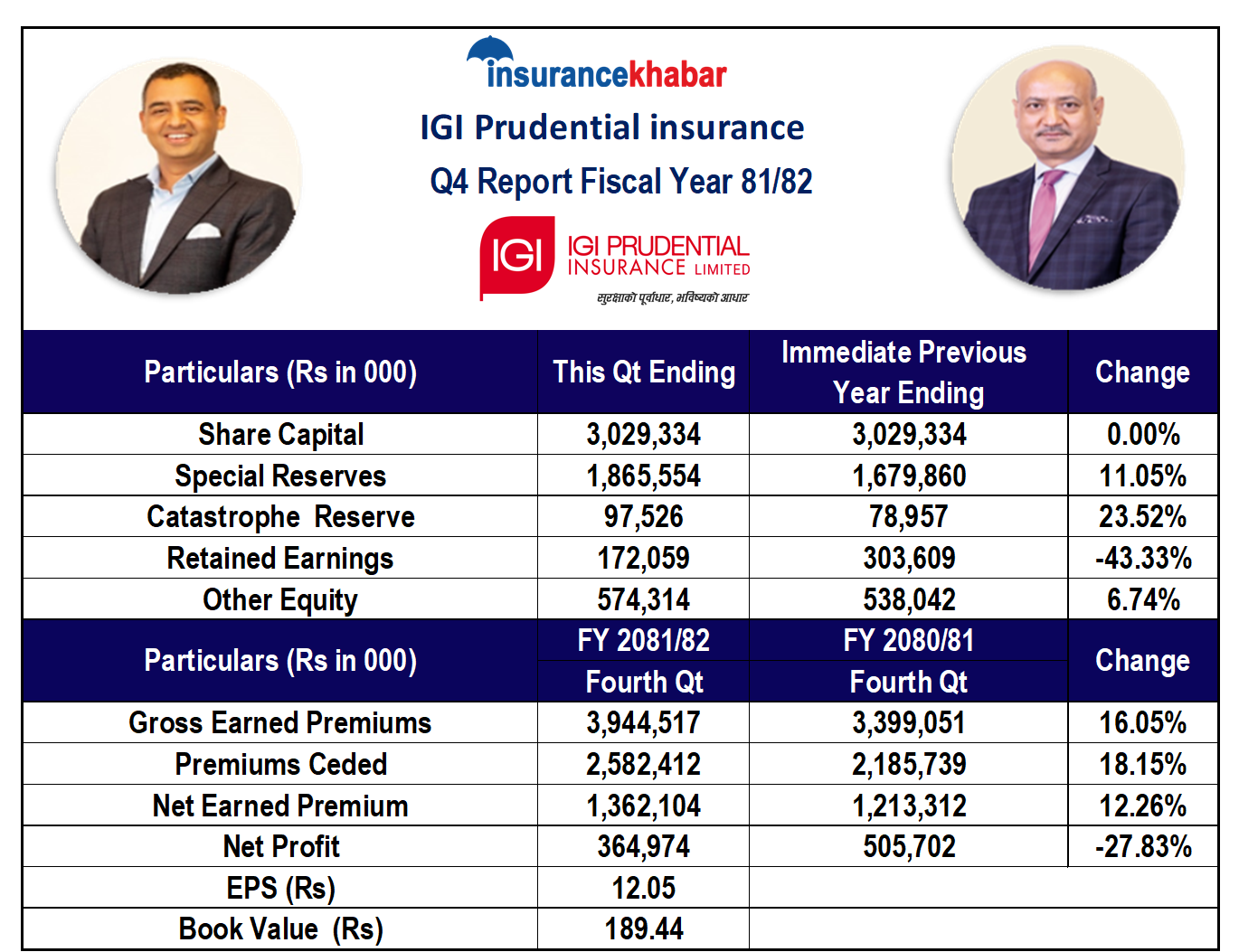 काठमाडौं । आइजिआई प्रुडेन्सियल इन्स्योरेन्स कम्पनीले गत आर्थिक वर्ष २०८१ /८२ को चौथोे त्रैमासम्मको अपरिष्कृत वित्तीय विवरण सार्वजनिक गरेको छ । समीक्षा अवधिमा कम्पनीको नाफा बाहेक अधिकांश सूचक बढेका छन् ।