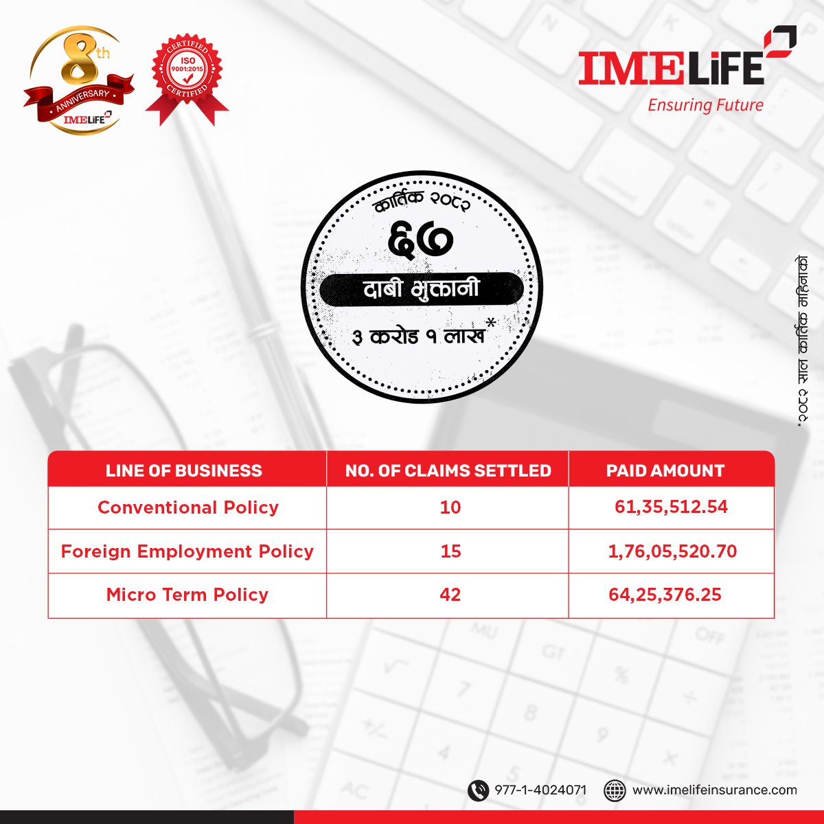कम्पनी म्यादी बीमाको ४२ वटा दाबीको ६४ लाख २५ हजार ३७६ रुपैयाँ भुक्तानी गरेको छ।