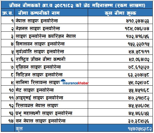 यस अवधिमा सबैभन्दा धेरै नेपाल लाइफ इन्स्योरेन्स कम्पनीले कुल बीमाशुल्क संकलन गरेको छ । कम्पनीले यस अवधिमा ४१ अर्ब २ करोड ४४ लाख रुपैयाँ कुल बीमाशुल्क संकलन गरेको छ । दोस्रोमा नेशनल लाइफ रहेको छ । कम्पनीले यस अवधिमा १८ अर्ब ९० करोड ४६ लाख रुपैयाँ कुल बीमाशुल्क संकलन गरेको छ । तेस्रोमा एलआइसी नेपाल रहेको छ । कम्पनीले यस अवधिमा १७ अर्ब २४ करोड १६ लाख रुपैयाँ कुल बीमाशुल्क संकलन गरेको छ । हिमालयन लाइफले १५ अर्ब २२ करोड २० लाख रुपैयाँ कुल बीमाशुल्क संकलन गरेको छ ।