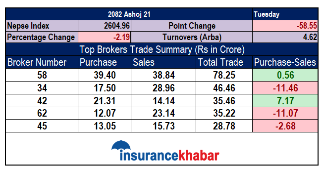 काठमाडौं । मंगलबार नेप्से परिसूचक २६०४.९६ विन्दुमा पुगेर बन्द भएको छ । यस दिन परिसूचक ५८.५५ अंकले घटेको छ। ४ अर्ब ६२ करोड कारोबार भएको दिन ब्रोकर नम्बर ५८ बाट सर्वाधिक रकमको कारोबार भएको छ । ब्रोकर नम्बर ५८ बाट ७८ करोड २५ लाखको कारोबार भएको छ जसमा ३९ करोड ४० लाखको खरिद भएको छ भने ३८ करोड ८४ लाखको विक्री भएको छ ।