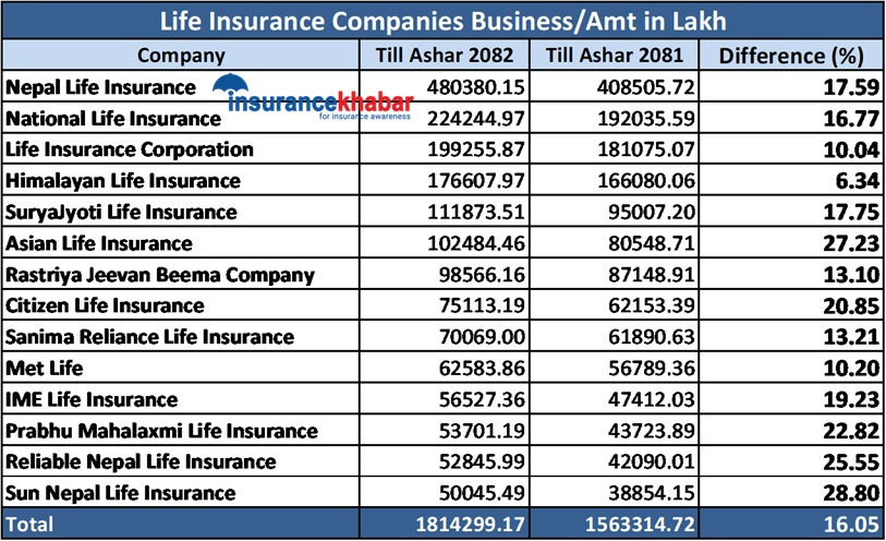 अघिल्लो वर्षको तुलनामा समीक्षा अवधिसम्म सबै १४ वटै जीवन बीमकको व्यापार बढेको छ। सर्वाधिक व्यापार भित्र्याउनेमा नेपाल लाइफ रहेको छ भने वृद्धिदरका हिसाबले सन नेपाल लाइफ अगाडि रहेको छ।