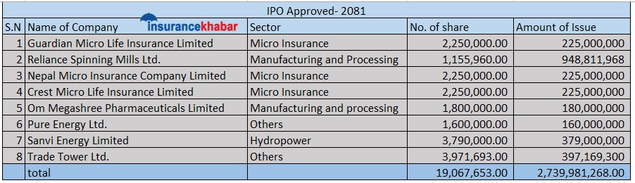 यी कम्पनीहरुले कुल २ अर्ब ७३ करोड ९९ लाख ८१ हजार २६८ रुपैयाँ बराबरको १ करोड ९० लाख ६७ हजार ६५३ कित्ता आइपीओ बिक्री अनुमति पाएका थिए ।
