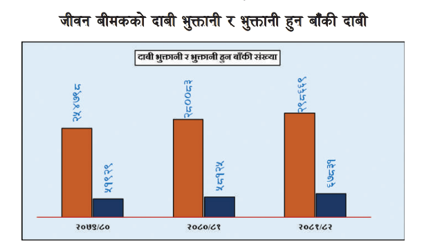 यसबाहेक दाबी भुक्तानी संख्यामा पनि क्रमशः वृद्धि देखिएको छ। आर्थिक वर्ष २०७९।८० मा ५१ हजार ९२९ वटा जीवन बीमा दाबी भुक्तानी गर्न बाँकी रहेको थियो। अघिल्लो आर्थिक वर्ष २०८०।८१ र गत आर्थिक वर्ष २०८१।८२ मा यो संख्या क्रमशः ५८ हजार १२५ र ६७ हजार ८३१ वटा पुगेको देखिन्छ।