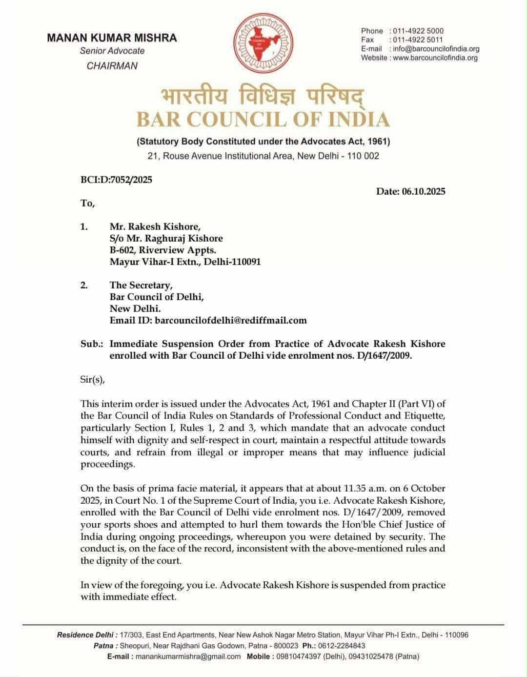किशोरले प्रधानन्यायाधिश भुषण रामाकृष्ण गवईमाथि जुत्ता प्रहार गरेका थिए। पेशागत मर्यादा विपरित गतिविधि गरेको भन्दै भारतीय विधिज्ञ परिषदले निजको इजाजत पत्र नम्बर डी-१६४७-२००९ निलम्बन गर्ने निर्णय गरेको हो।