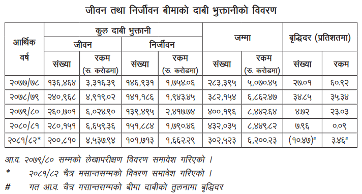 त्यसैगरी निर्जीवन बीमकले क्षतिपूर्ति दाबीबापत बीमितलाई कुल ९५ अर्ब ६८ करोड रुपैयाँ दाबी भुक्तानी दिएका छन्। निर्जीवन बीमकले ६ लाख ८१ हजार बीमा दाबीबापत यो रकम दाबी भुक्तानी गरेका हुन्।